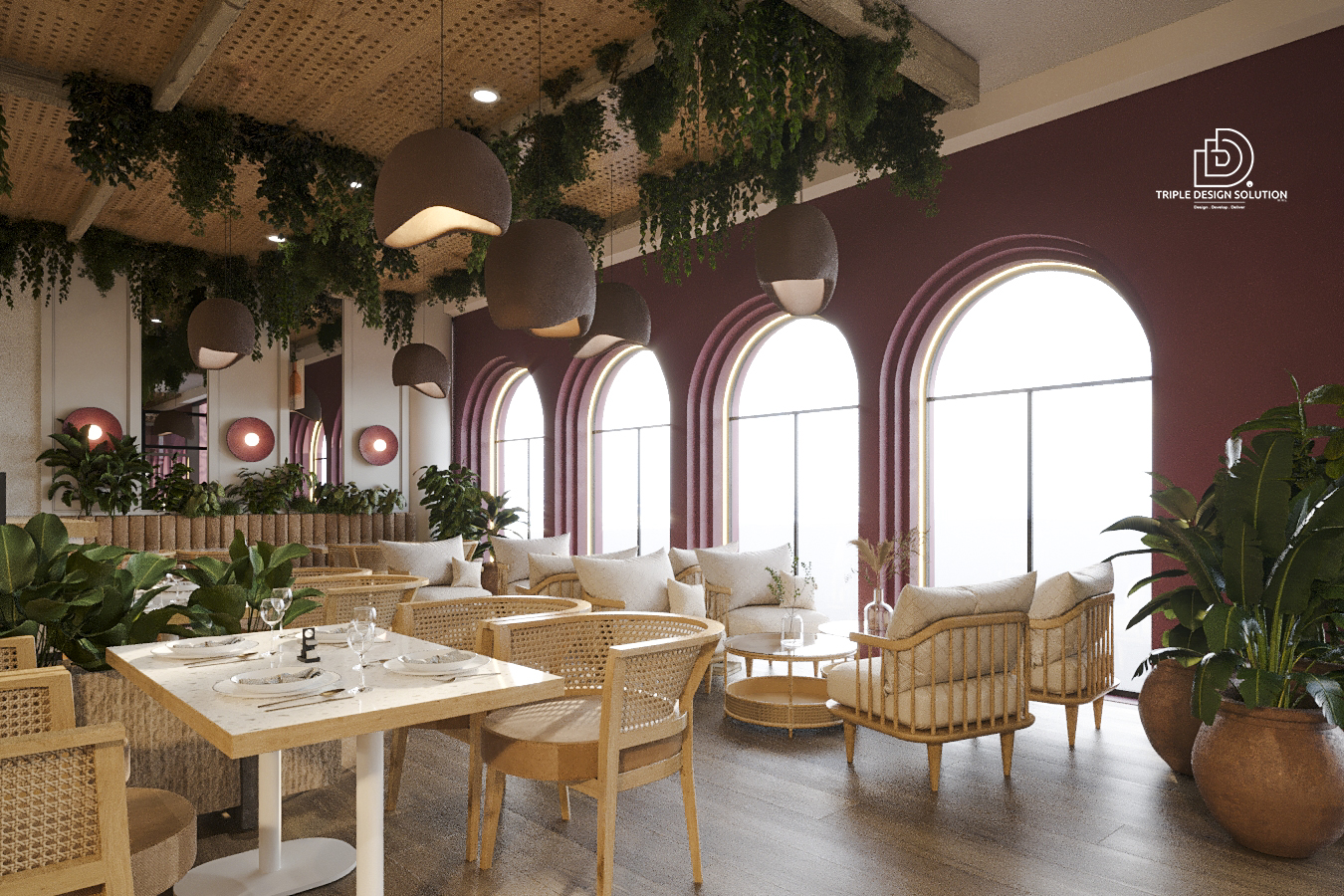 We turned a backyard area into a unique cafe with beautifully designed landscape. The drawings on the wall, flower frames and greenery ceilings differentiate the space and give it a unique ambience.