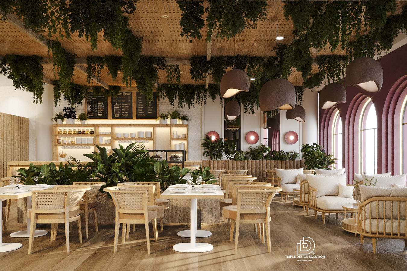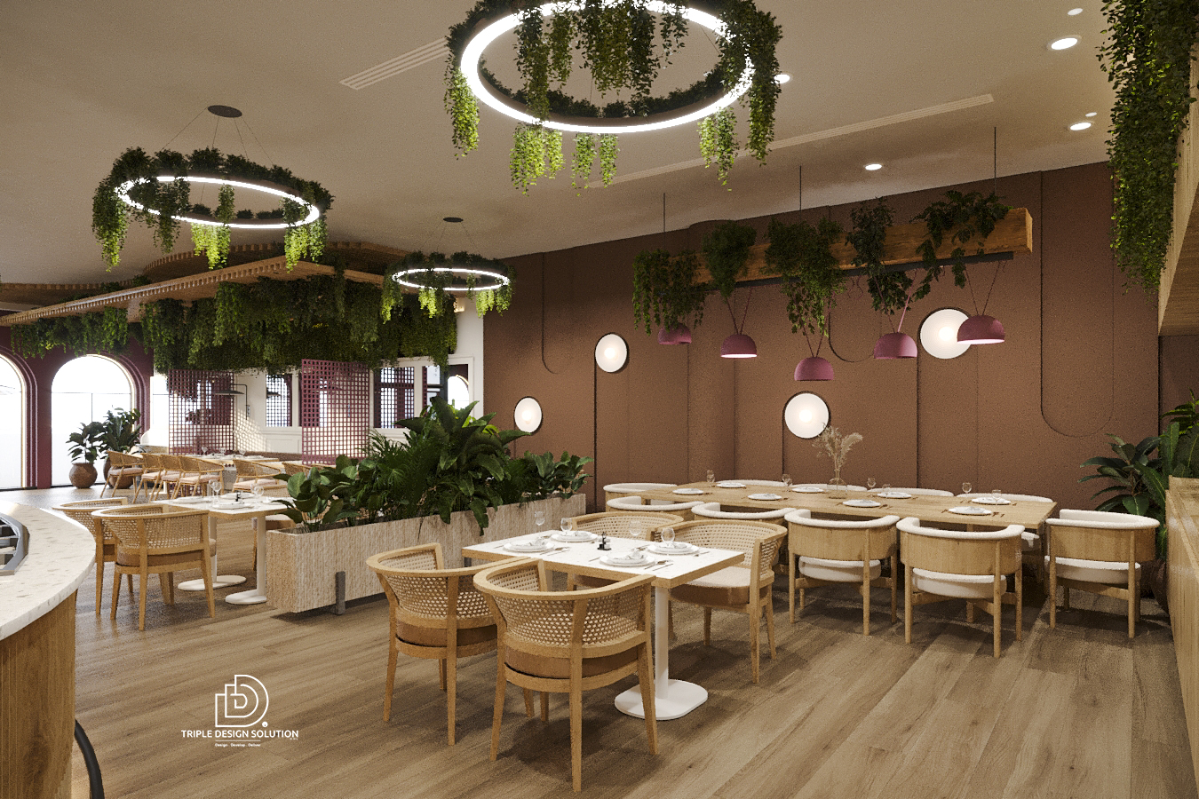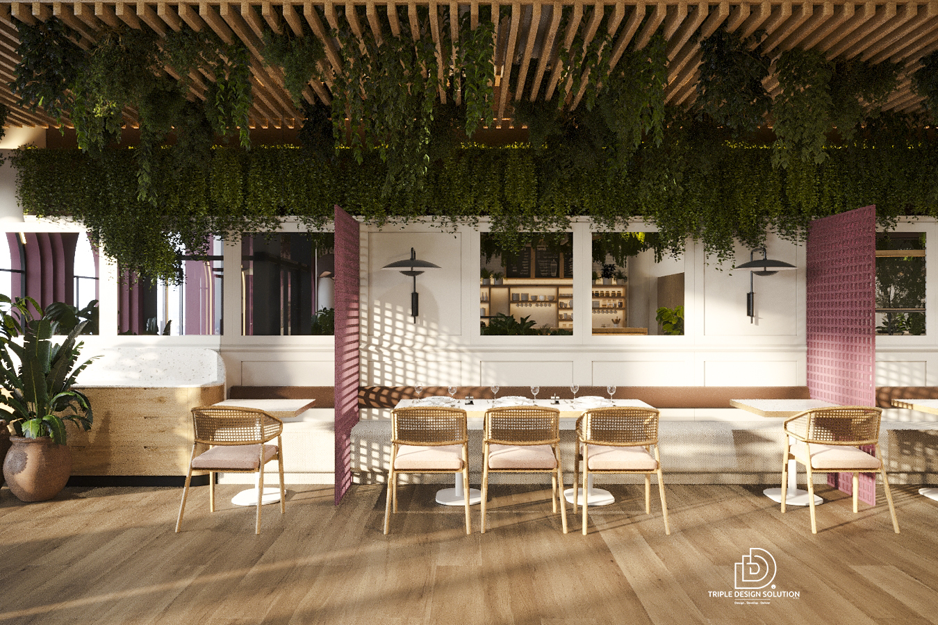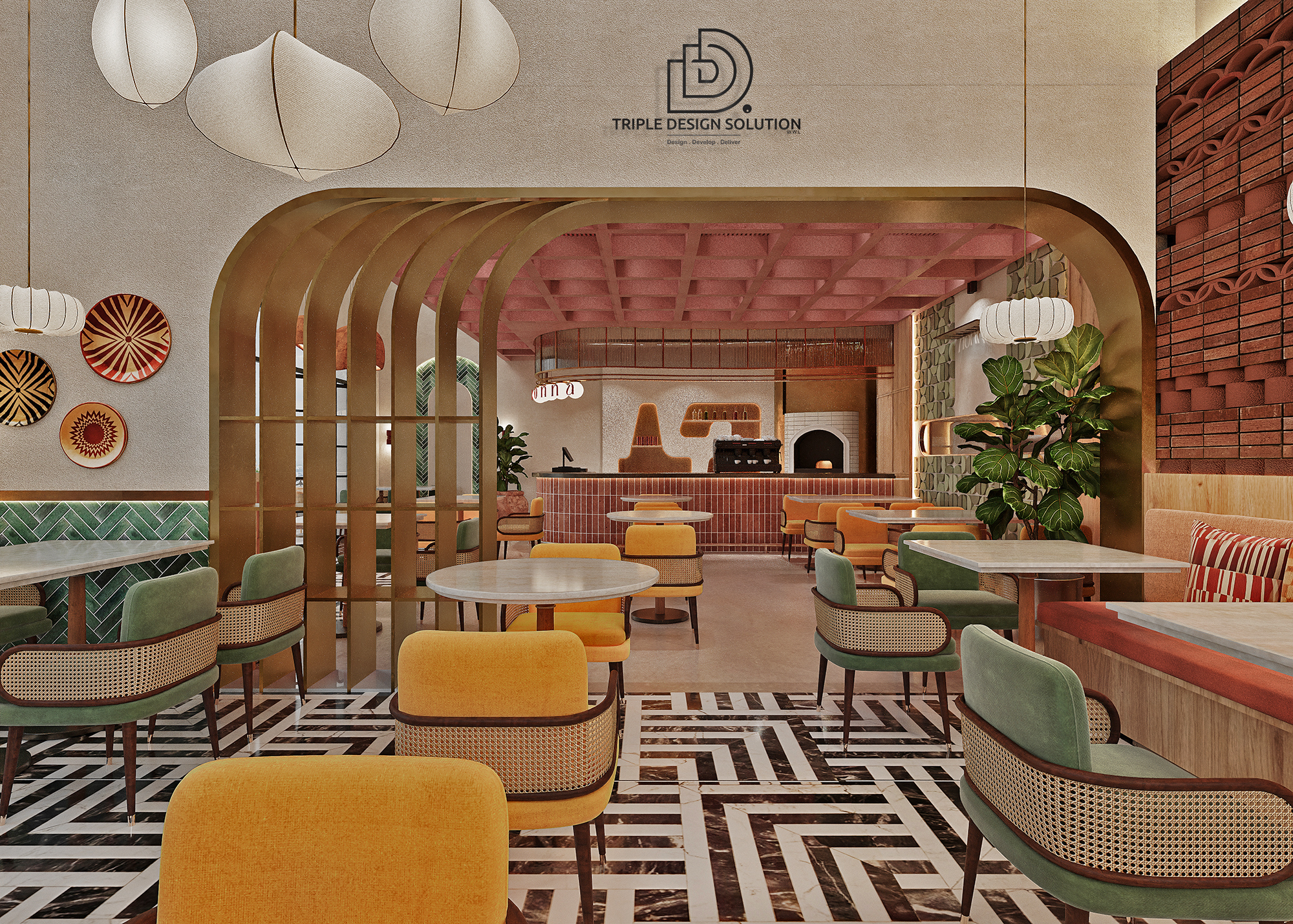 In this open kitchen restaurant, we installed a pleasant greenery wall to break the monotonous colors used and focused our attention on the pattern details covering Floor to Ceiling.