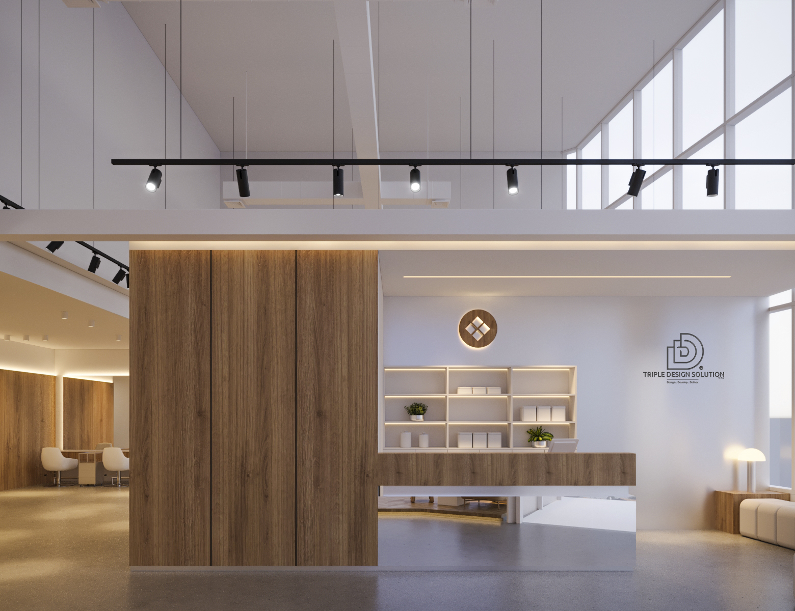 The symmetrical designing where flooring completes ceiling patterns and the practicality of product display are the highlights of this design. The choice of white and gold add the luxurious mood to the place which suits well the place’s concept.