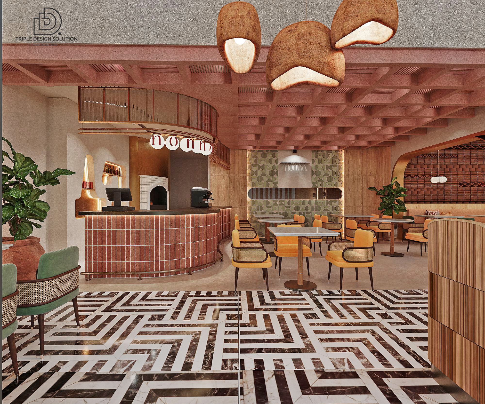 Our focus was to transform a raw place to a fully equipped restaurant that matches the 3D Design Maps at all levels. The combination of wood and marble installed in the restaurant was the highlight.